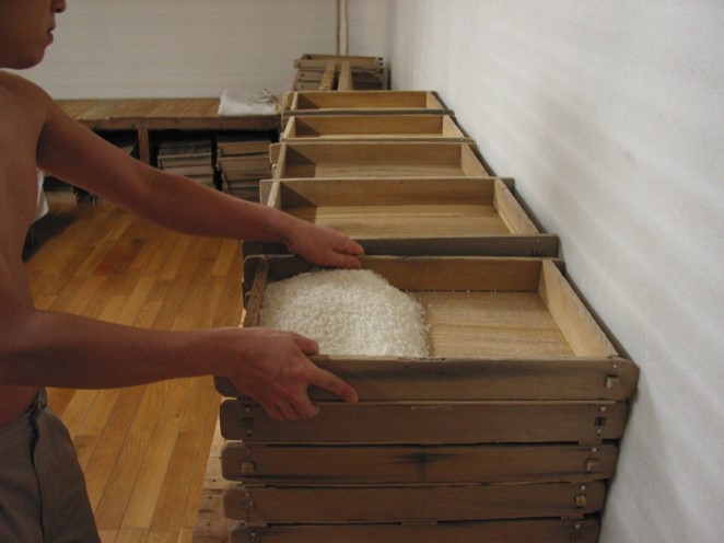 古くからの伝統的な製法を守り、大きな和釜の上に、杉の木でできた木の樽にお米を入れて蒸す、甑(こしき)を乗せる方法をとっております。その後の麹を作る作業では、小さな麹蓋(こうじぶた)を使うことで、大変手間暇がかかりますが、一つ一つ手をかけていくことで、きめ細い作業ができて、良い麹作りに繋がっています。古式伝承による酒造りを文化としても受け継いでいらっしゃいます。