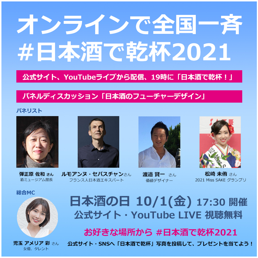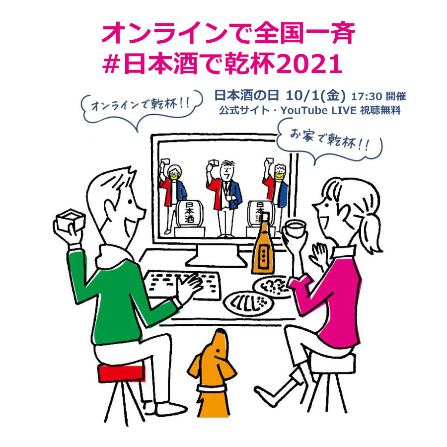 「日本酒の日」10月1日(金)は、オンラインで沢山の方が、自由に参加できる日本酒で乾杯イベントを、YouTube LIVEから動画配信します。オンラインでご自宅、店舗や全国のイベント会場をつなぎ、19時にオンラインで全国一斉「#日本酒で乾杯2021」を行います。距離の壁を越えて、同時刻に日本酒で乾杯をすることで、人が集まることが難しいコロナ禍でも心をひとつにします。