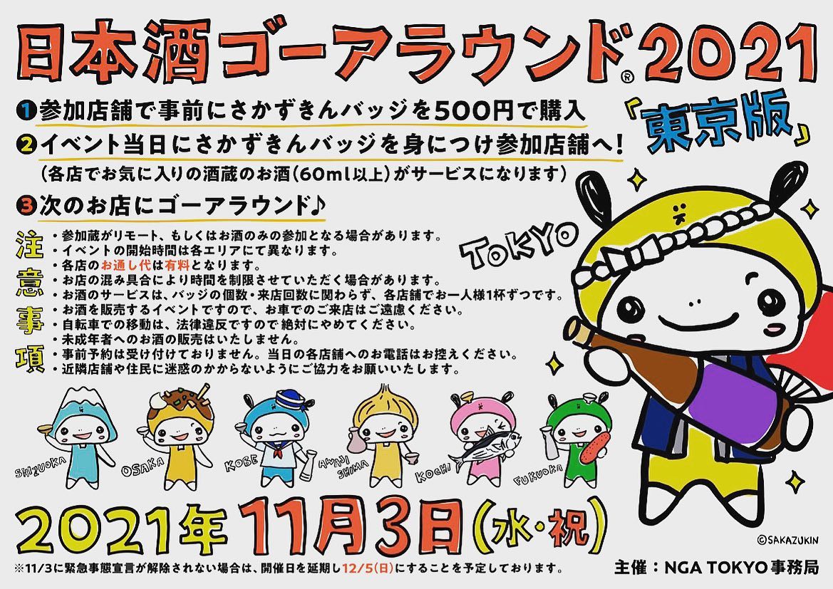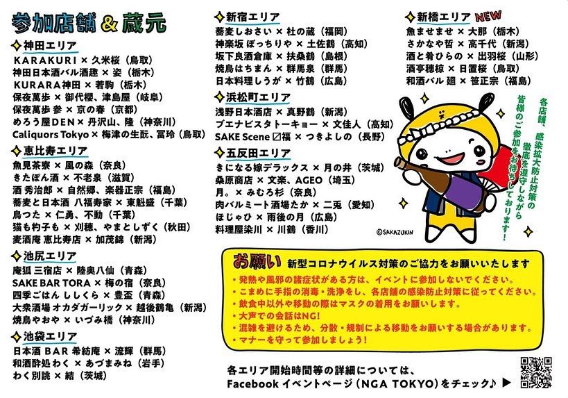 | 問合せ | <主催>NGA TOKYO事務局 *Facebookページをご確認ください。 <参加店舗&参加蔵情報> *詳細は各店舗様の情報をご確認ください。 *各店舗様の情報の確認には、新橋・酒と肴ひら様の常連様が作られた店舗一覧が便利です。 以下のURLから店舗一覧をご覧いただけます。 |