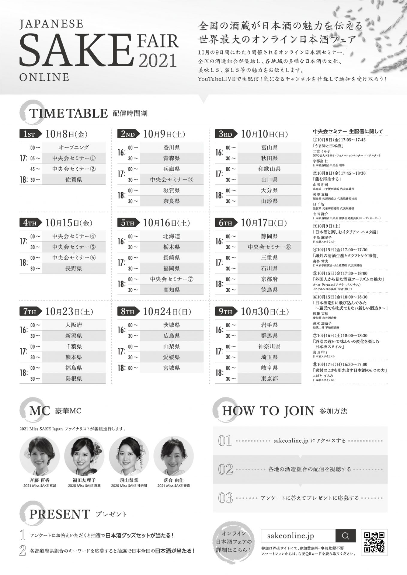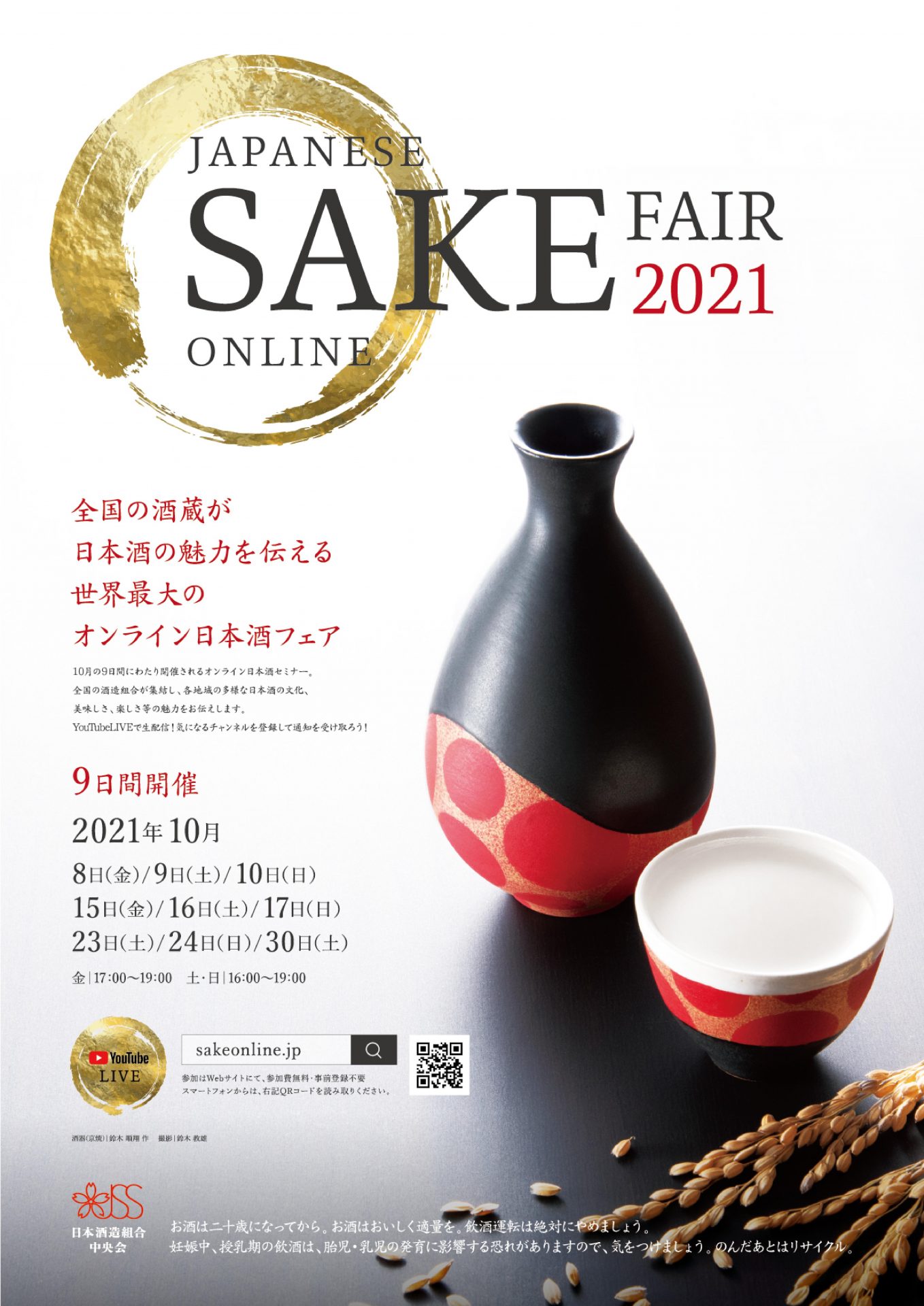10月8日(金)、9日(土)、10日(日)、15日(金)、16日(土)、17日(日)、23日(土)、24日(日)、30日(土)の9日間にわたり開催される世界最大の日本酒オンラインセミナー。全国の酒造組合が集結し、各地域の多様な日本酒の文化、美味しさ、楽しさ等の魅力をお伝えします。YouTube Liveで生配信されます!