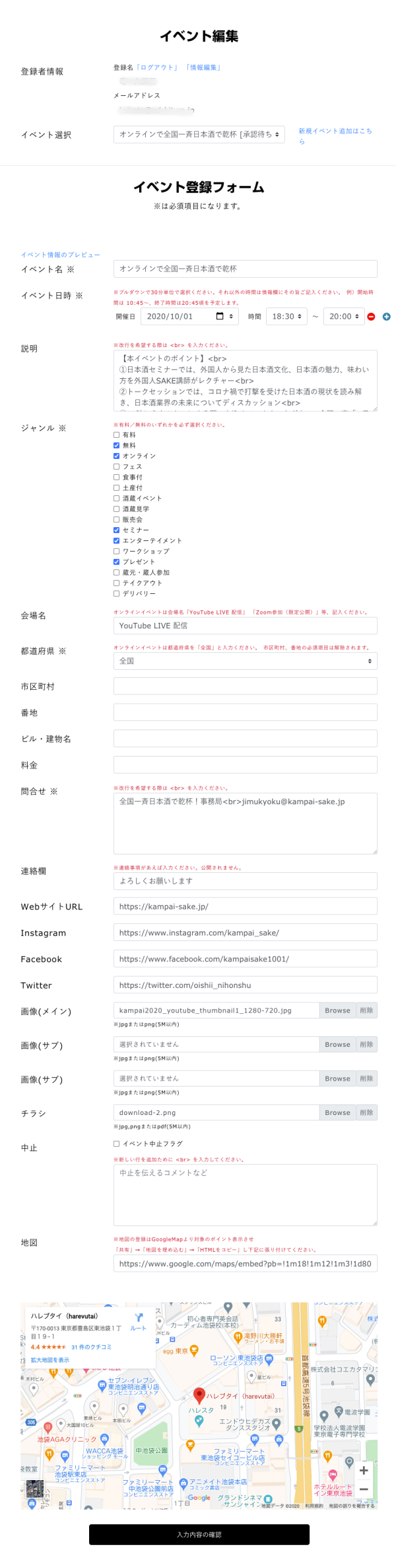入力を終えたら「入力内容の確認」をクリックし、表示された画面で入力内容を確認し、「イベント情報の登録」をクリックして登録が完了します。
